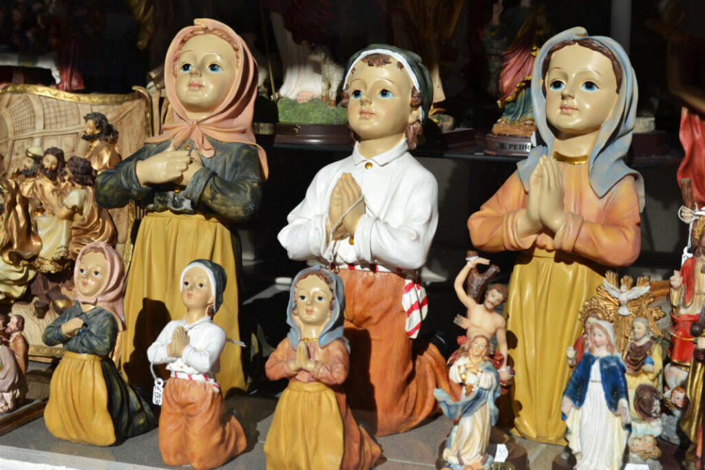 Sklepy z dewocjonaliami są wszędzie. I mam na myśli: WSZĘDZIE. Plastikowe figurki, butelki na wodę świętą w kształcie Matki Boskiej, świecące różańce. Jeśli szukacie pamiątek, szukajcie czegoś z gustem – są też sklepy z porządną ceramiką, książkami, prostymi różańcami z drewna oliwnego.
